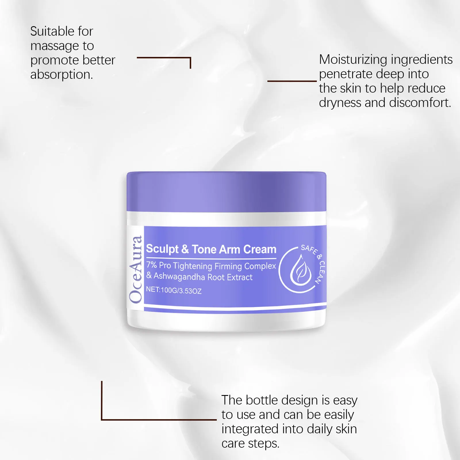 OceAura Arm Shaping Firming Cream is a 100g skincare product designed to tighten, tone, and smooth the skin. It penetrates deeply to boost collagen production, improving elasticity and reducing sagging for firmer, more sculpted arms. The formula also supports fat metabolism, helping reduce excess fat and enhance arm contours over time. Rich moisturizing ingredients hydrate and improve skin texture while strengthening the skin barrier. It also soothes muscles and relieves tension during massage. Suitable for arms, thighs, and abdomen, it’s easy to apply and absorb. Store in a cool, dry place and use regularly for best results.